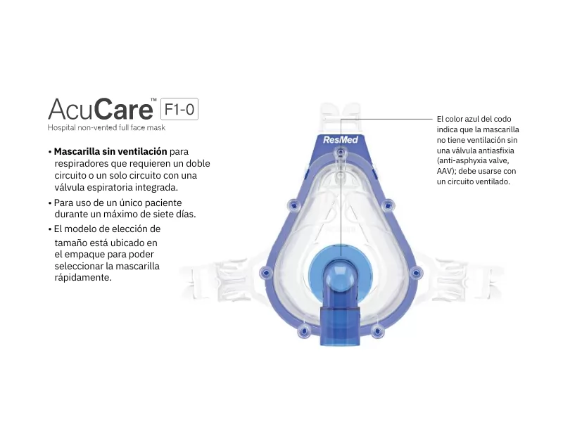 La AcuCare F1-0 no ventilada ofrece un diseño ergonómico y resistente, ideal para terapias ventilatorias en hospitales. Asegura un sellado firme y cómodo, con materiales suaves que mejoran la experiencia del paciente. Su estructura facilita la colocación y el retiro, haciéndola práctica para el personal médico. Es una opción eficaz y confiable para un soporte respiratorio seguro y estable.